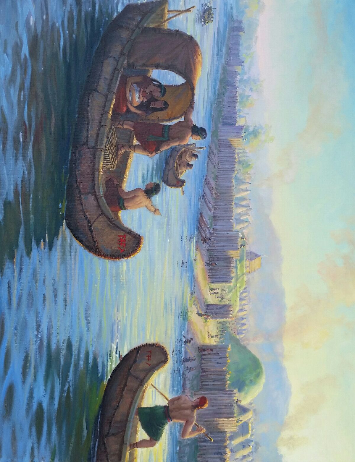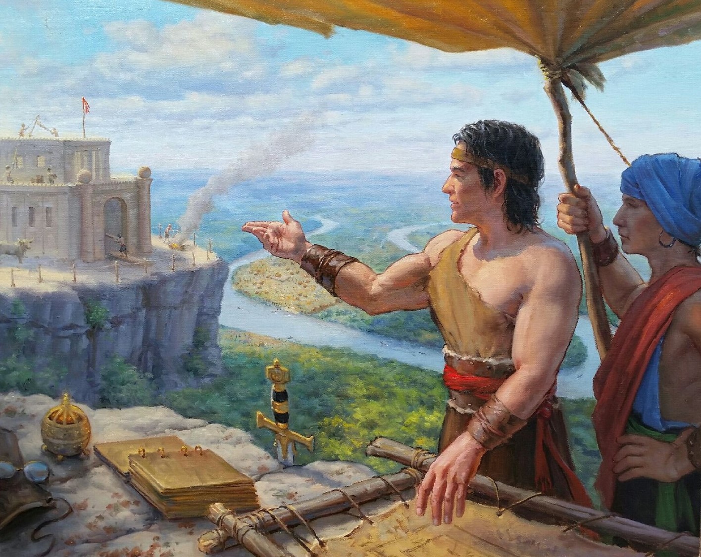 In this painting, Zelph is shown  sometime between 322-327 AD, on the same mound above the Illinois River where the Prophet Joseph Smith received a vision of this great warrior in 1834. Prophet Onandagus is seen praying for the freedom of his people. Nearby is, “the appearance of three altars having been erected one above the other, according to the ancient order”, as Joseph’s vision had indicated. In the distance you see some Lamanites in a canoe on the Illinois river.