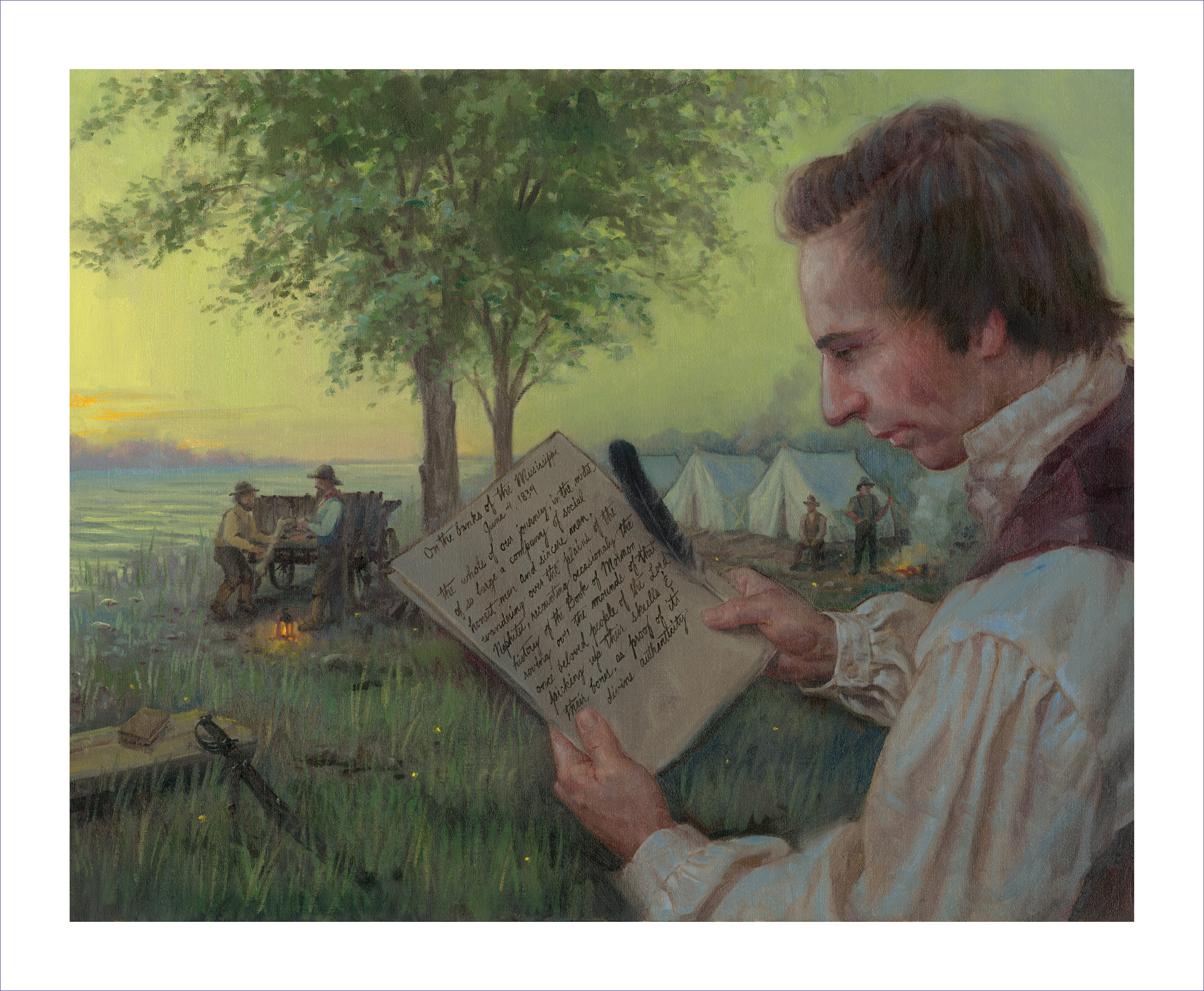 Plains of the Nep_24x30   “On the banks of the Mississippi, June 4th. 1834. My Dear Companion, I now embrace a few moments to dictate a few words that you may know how it is with us up to this date. We arrived this morning on the banks of the Mississippi, and were detained  from crossing the river, as there was no boat that we could cross in, but expect  a new one to be put into the river this evening, so that we are in hopes, to be able to  cross tomorrow, and proceed on our journey. A tolerable degree of union has prevailed among the brethren or camp up to the present moment, and we are all in better circumstances of health apparently than when we started from Kirtland… The whole of our journey, in the midst of so large a company of social honest men and sincere men, wandering over the plains of the Nephites, recounting occasionaly the history of the Book of Mormon, roving over the mounds of that once  beloved people of the Lord, picking up their skulls & their bones, as a proof of its  divine authenticity…” (Signed Personally) Joseph Smith Jr.” Joseph to Emma, 6.4.1834. Retained copy in handwriting of James Mulholland, Joseph Smith Letterbook 2, pp. 56–58, LDS Church Archives