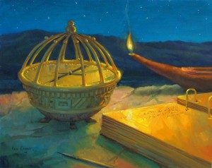 Apparently for convenience, Joseph often translated with the single seer stone rather than the two stones bound together to form the interpreters. These two instruments—the interpreters and the seer stone—were apparently interchangeable and worked in much the same way such that, in the course of time, Joseph Smith and his associates often used the term “Urim and Thummim” to refer to the single stone as well as the interpreters.21 In ancient times, Israelite priests used the Urim and Thummim to assist in receiving divine communications. Although commentators differ on the nature of the instrument, several ancient sources state that the instrument involved stones that lit up or were divinely illumined.22 Latter-day Saints later understood the term “Urim and Thummim” to refer exclusively to the interpreters. Joseph Smith and others, however, seem to have understood the term more as a descriptive category of instruments for obtaining divine revelations and less as the name of a specific instrument.